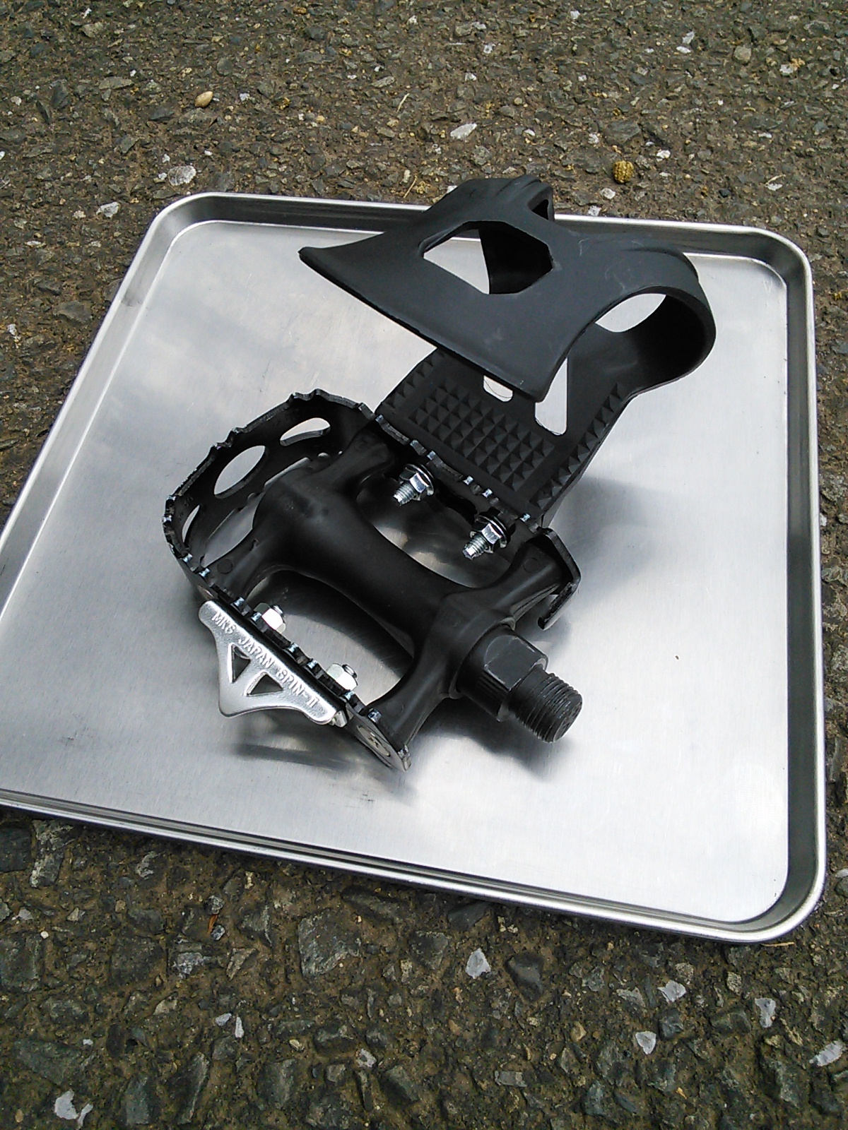 ペダルから反射板を外しました。ケージの穴に刺さっているだけなので、ただ引っ張って抜きました。